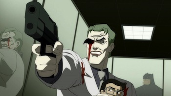 I applaud DC animated for not shying away from the bloody carnage the Joker enacts on the late night David Endocrine Show and in the amusement park.The Endocrine scene is a real treat; in the original series, it was a David Letterman spoof. But it’s Conan O’Brien who lends his real voice here, and it really sells the scene. When the Joker releases his deadly laughing gas it’s quite disturbing to see the audience and Endocrine perish.